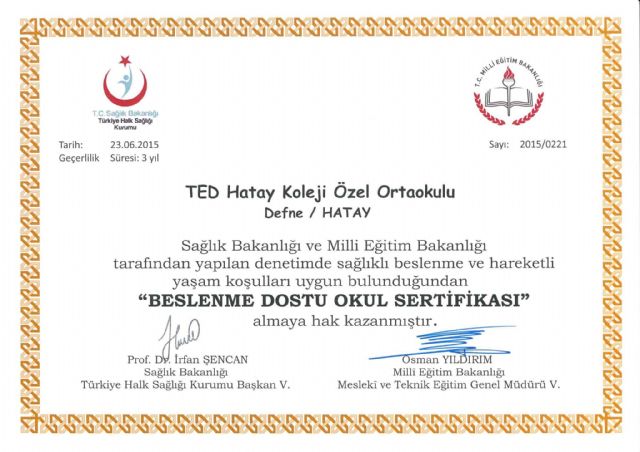 TED Hatay Koleji hijyen için aldığı ‘Beyaz Bayrak’tan sonra yapılan denetimler sonucunda ilimizde ‘Beslenme Dostu’ okul sertifikası almaya hak kazanan 10 okuldan biri ve